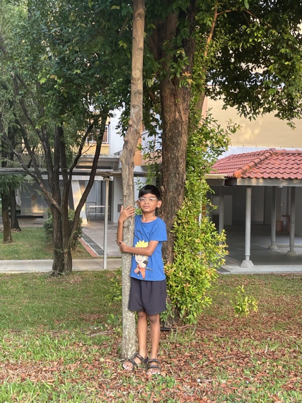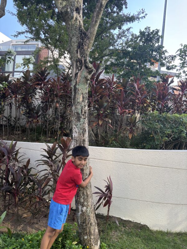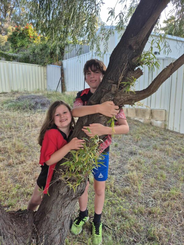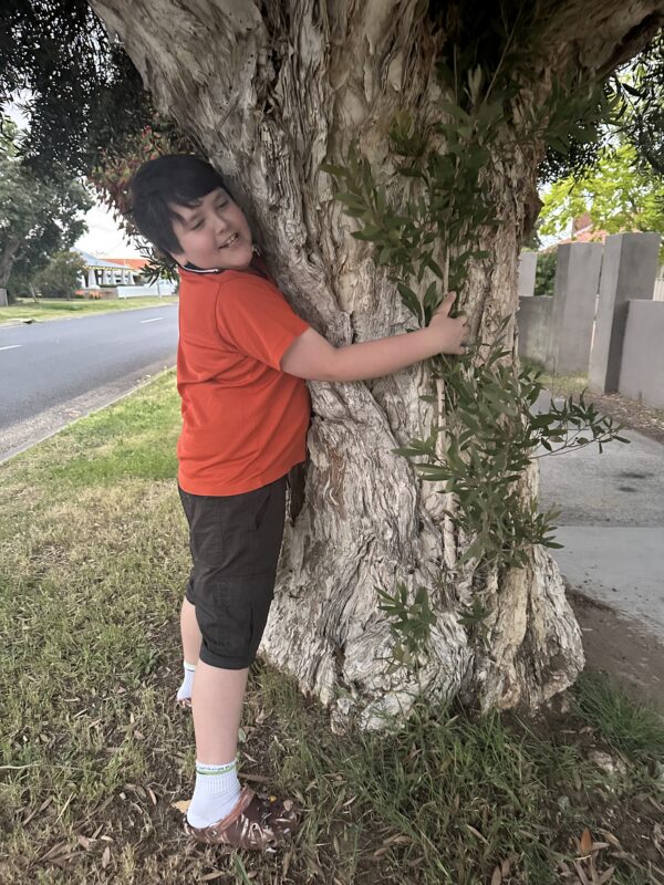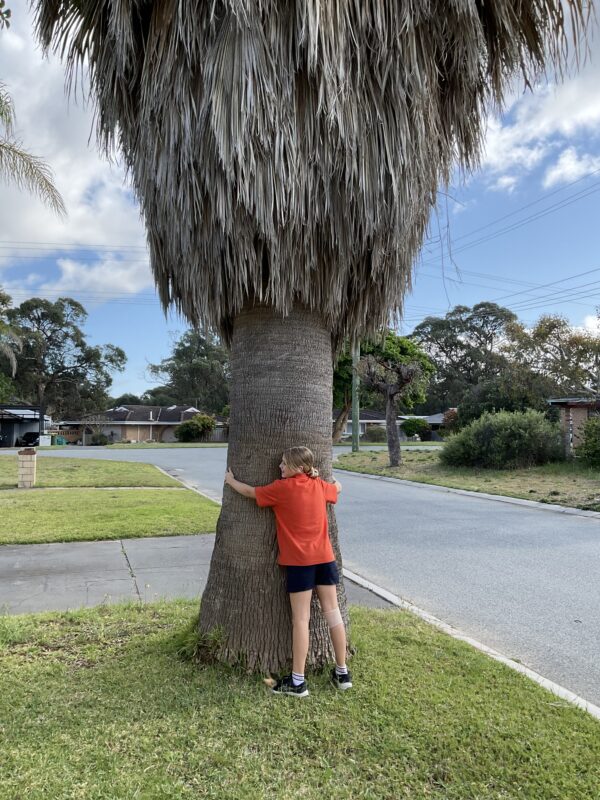 I hugged this peppermint tree for 3 minutes, and it make me feel happy. I wondered how high I could climb up it. I love trees because they give us shade on a hot summer’s day (William) and because the fairies need homes (Summer).