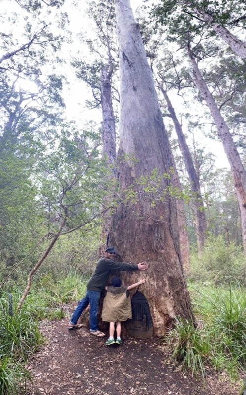 Luke and Taj hugging a giant tingle tree near Walpole. Also see the fairy door!